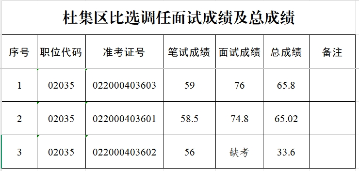 杜集区比选调任面试成绩及总成绩